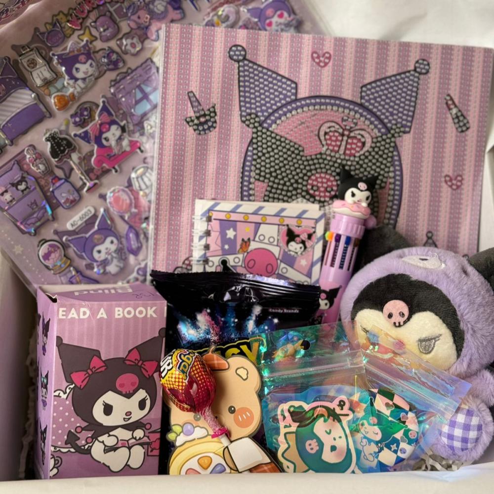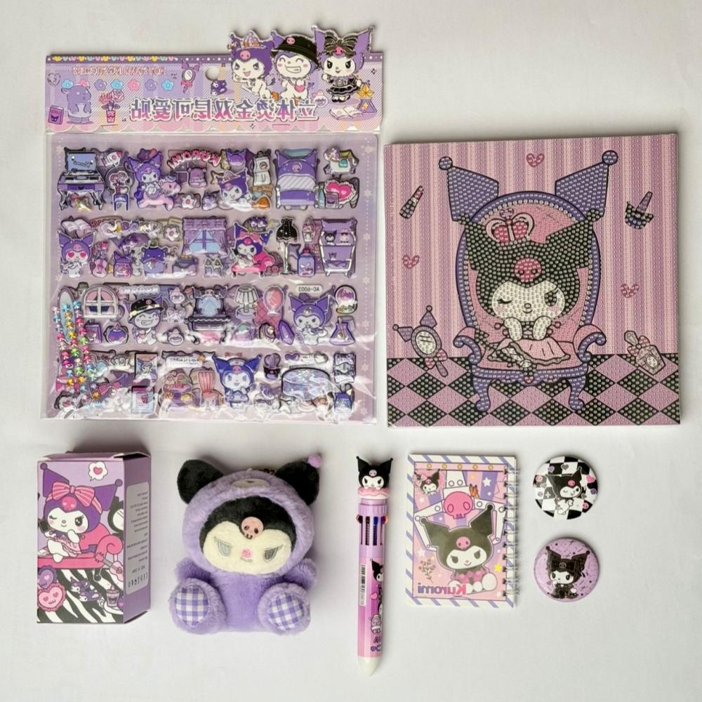 1. دفتر ملاحظات بموضوع كرومي: دفتر مربع الشكل مع رسم لشخصية كرومي على الغلاف، يظهر فيه كرومي جالسًا على كرسي ملكي بألوان داكنة ومزينة بلمسات من الباستيل.